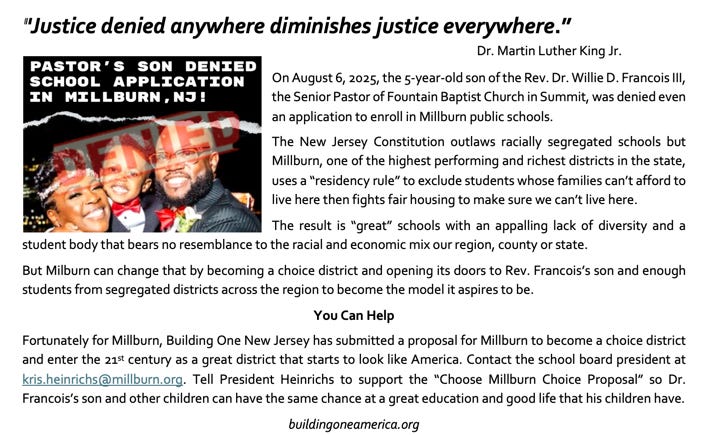 The student who was denied even an application was the 5-year-old son of the Rev. Dr. Willie D. Francois III, the Senior Pastor of Fountain Baptist Church in Summit, NJ. Rev. Francois works near some of New Jersey’s most affluent towns and the best schools, in which he (and most Black families in New Jersey) cannot afford to live.